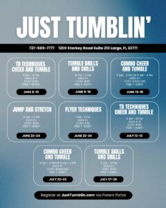 In 1992 Just Tumblin’ was founded on the focus of providing quality instruction to every for cheerleaders wanting to learn how to tumble. As our program grew we expanded to working with all ages and types of tumbling interests. From gymnasts, to tiny tots, fitness competitors, and even parkour athletes, we provide instruction that teaches proper progressions in floor tumbling. We continue to train cheerleaders as well in tumbling, jumps, stunts, and dance. Just Tumblin’ offers classes, clinics, private lessons, open gyms, summer camps, birthday parties, and gym rentals.