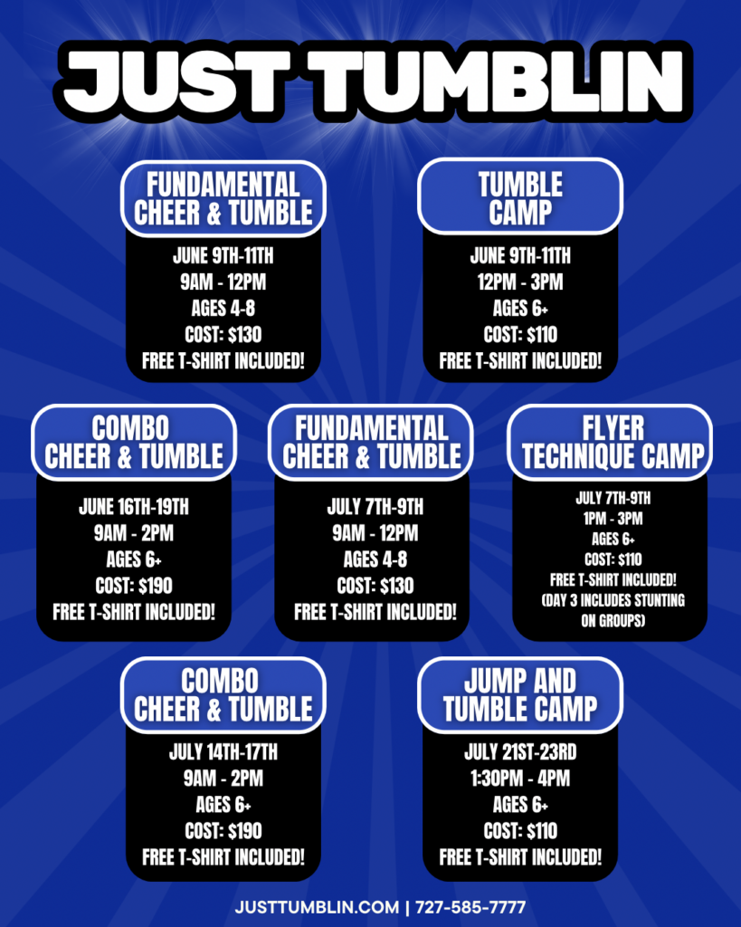 Come join us for one or more of our skill based summer camps. We have lots to choose from: flyer technique camp, tumble camp, jump & tumble, cheer& tumble for all ages! No experience necessary. Registration opens March 1, 2025. Space is limited. Click HERE to register in our parent portal.